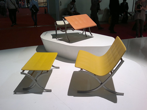 | French designer Matali Crasset tries her (Dynamic Life couch at Campeggi's booth ) via Azure |