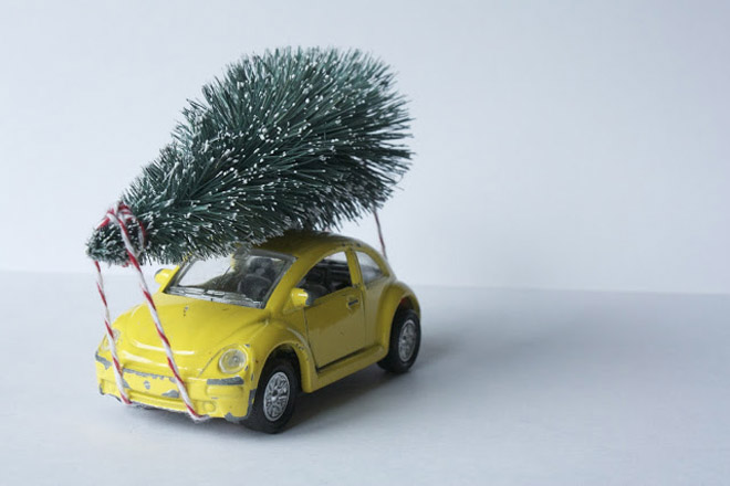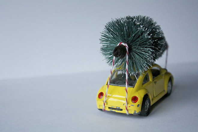 Step 2: Hot glue your tree to the roof of your car. Using bakers twine or string tie the tree to the car. I wrapped the string around the wheels and then secured the string to the bottom of the car with hot glue.