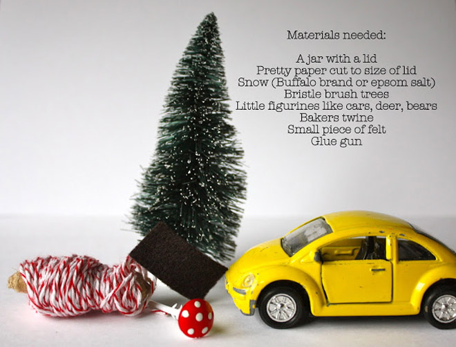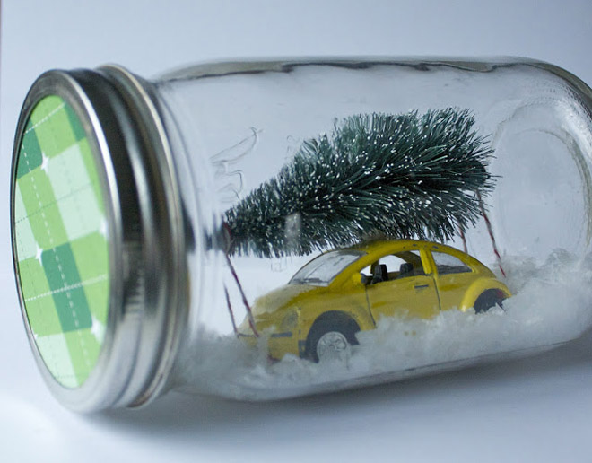 Step 4: Place your car in the jar and add snow until it looks like just enough. Cut out a pretty piece of paper to cover the lid and screw the ring on.